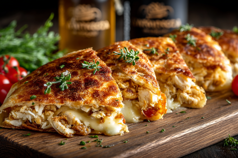 Это не чебурек, а настоящий мясной пирог-сюрприз. Внизу — ровный пласт приправленного куриного фарша. Посередине — два слоя сырного счастья: нежный, тающий творожный сыр и фонтан тягучего твердого сыра, перемежаемый половинками сладких черри. А сверху — ещё один пласт фарша, образующий хрустящую «крышку». Каждый кусок — это полноценное блюдо.