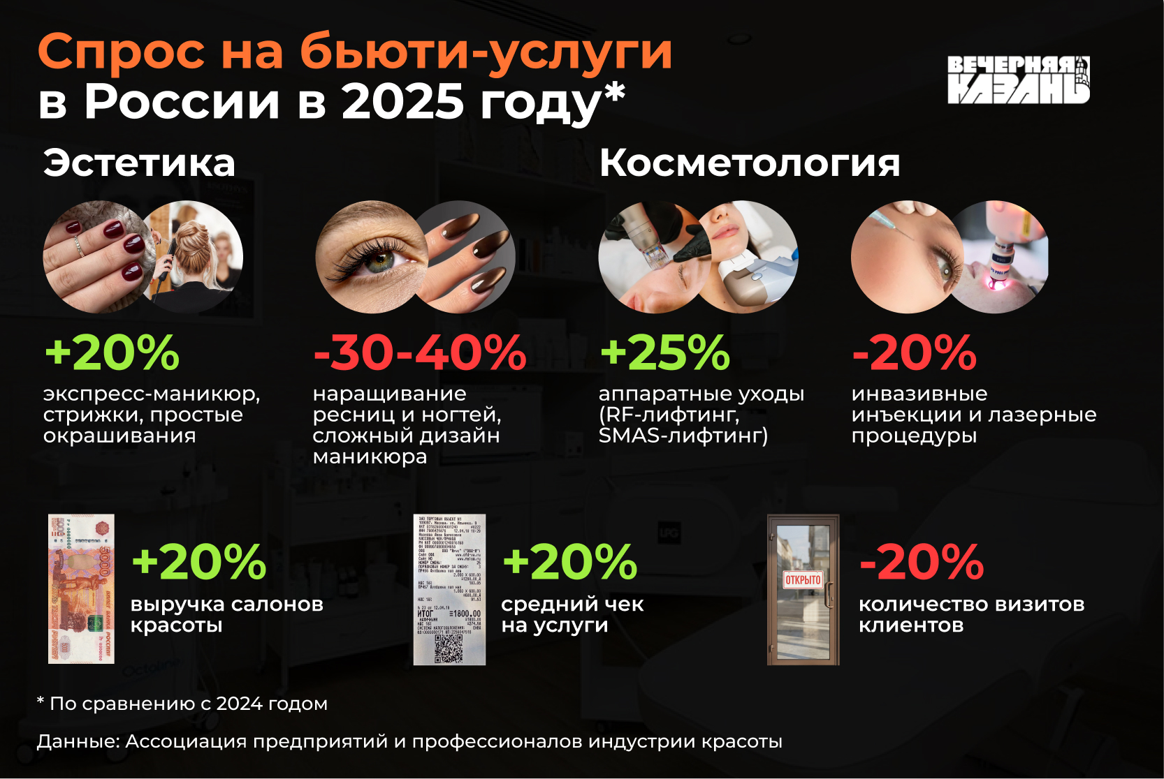 Несмотря на кризис, люди не перестают ухаживать за собой, но существенно экономят. В эстетическом сегменте, например, востребованными остаются экспресс-маникюр, стрижки и простые окрашивания. А вот наращивать ресницы и ногти, делать сложный дизайн маникюра клиенты стали гораздо меньше, предпочитая «натуральность без усилий». В медицинской косметологии спрос сосредоточен вокруг аппаратного ухода: увеличилась выручка на разные виды лифтинга кожи лица. На инвазивные инъекции и лазерные процедуры спрос, наоборот, снизился на 20%: причина, как и со стрижками и маникюром, кроется в цене. Инфляция и падение доходов населения приводят к сокращения набора бьюти-услуг до базового минимума.