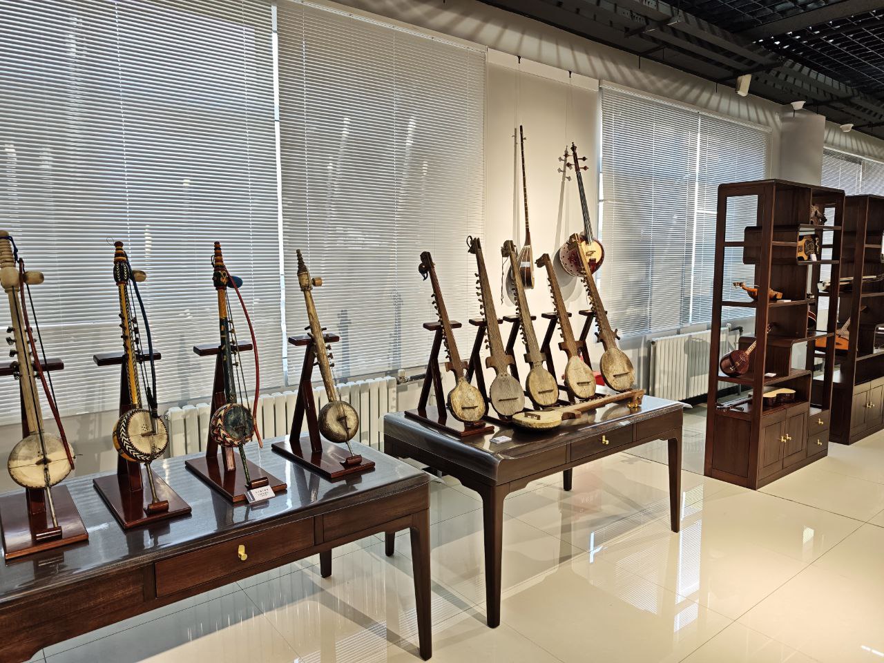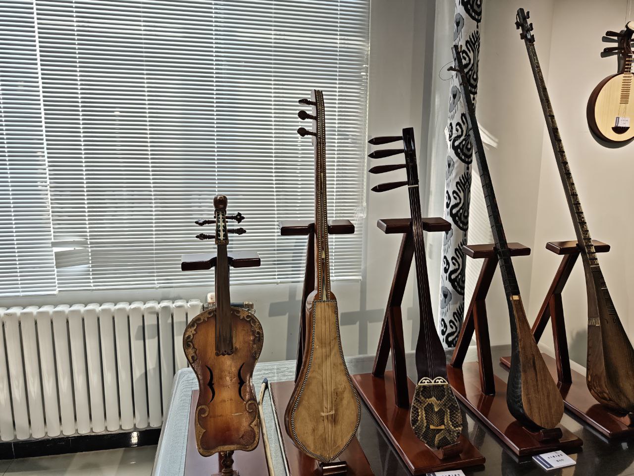 По словам одного из сотрудников павильона, экспозиция включает около 150 инструментов, большинство из которых изготовлены из дерева и требуют бережного ухода. В их числе — казахские национальные музыкальные инструменты, которые студенты института также изучают с живым интересом.