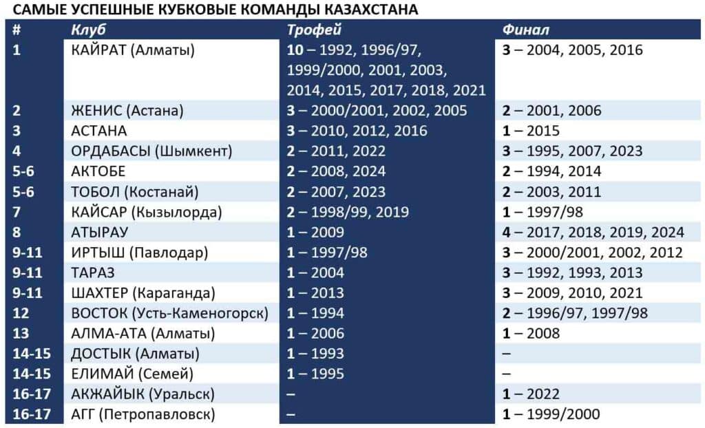 Кубок Казахстана разыгрывается с 1992 года. За 33 года его завоевывали 17 команд. Чаще других почётным трофеем владел алматинский «Кайрат».