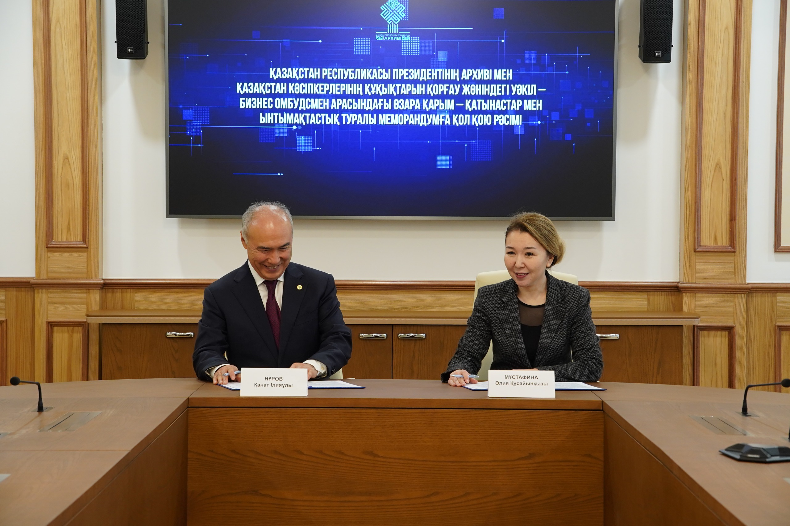 Документы были подписаны директором Архива Президента РК Алией Мустафиной совместно с Уполномоченным по защите прав предпринимателей Канатом Нуровым, а также с Уполномоченным по правам социально уязвимых категорий населения Кенжегулом Сейтжаном.