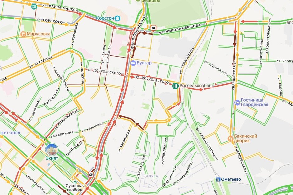 В Казани на момент 16:35 по мск фиксируются 7-балльные пробки. Согласно Яндекс.Картам, по городу отмечается множество аварий.
