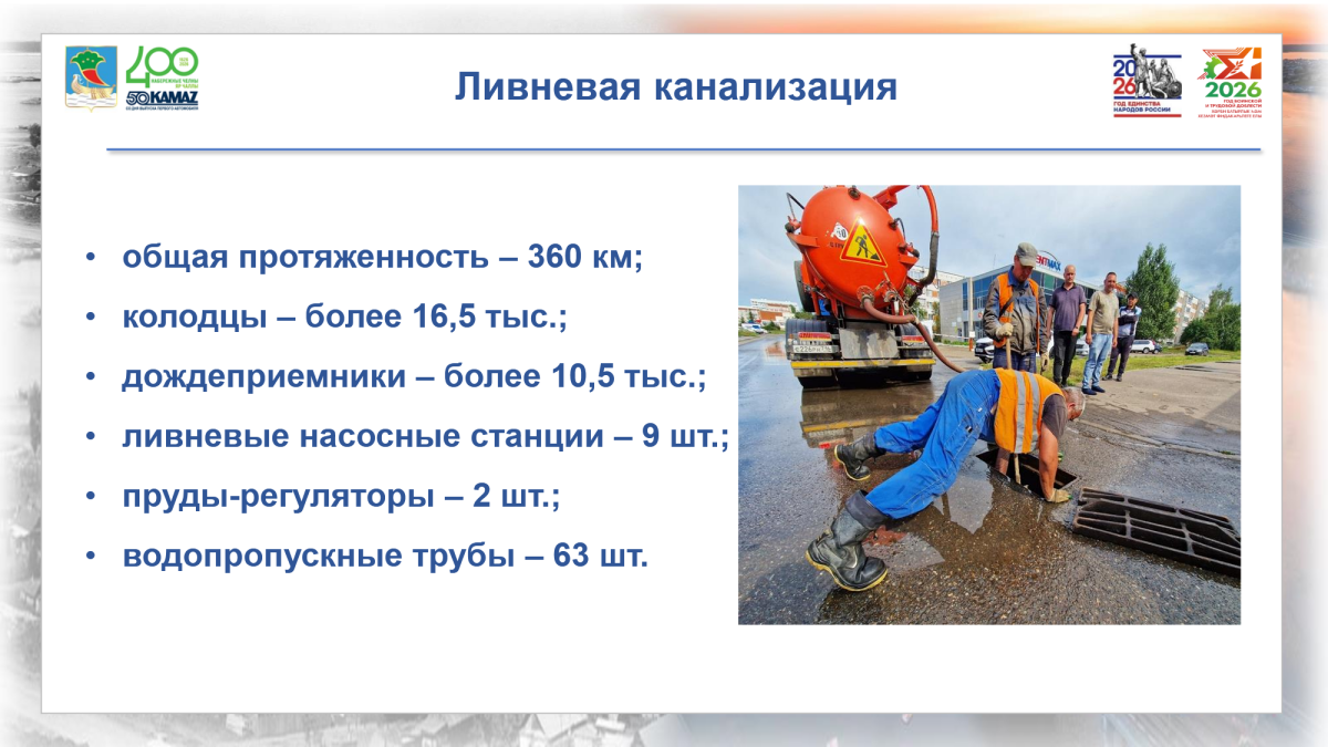 Параллельно продолжается подготовка ливневой канализации. Общая протяженность ливневых сетей в городе превышает 360 км и включает 16,5 тыс. колодцев, 10,5 тыс. дождеприемников, девять насосных станций и два пруда-регулятора. Очистка ливнеприемников проводится как на основных проспектах, так и во дворах жилых домов. Кроме того, специалисты восстанавливают отмостки и заменяют поврежденные люки.