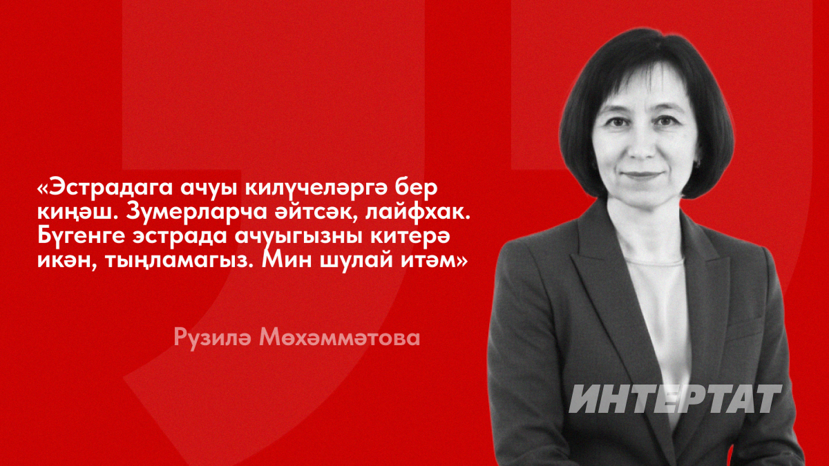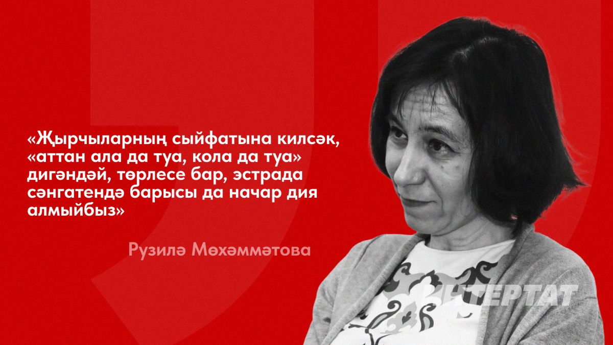 Эстрада дигәннән, тагын бер кызганыч әйбер – хәзер бу тирәлектә (хәер, хәзер генә түгел, күптән инде) җәмәгать эшлеклесе булырдай, үз сүзен әйтә алырдай затлар калмады. Илһам Шакировлар, Гөлзада Сафиуллиналар, Вафирә Гыйззәтуллиналар юк. Алар хәтле фикер йөртерлек башлары юкмы, әллә башны саклыйлармы? Ярар инде, татарча җырлыйлар бит дияр идең, хәзер бит алар татарча җырларга маташса да, русча сөйләшәләр. Татарча җырлаулары русча җырлап киңрәк мәйданга чыга алмаганнан, «ярамаган тагын» дип маташулары гына. Менә шундый телне бозып кыек-сыек җырлаучыларына протест белдереп, тыңламыйсы иде дә бит...