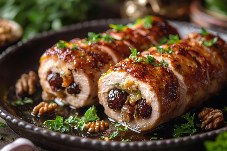 Для приготовления вам понадобится: 500 г куриного филе, 100 г чернослива без косточек, 50 г грецких орехов, 100 г твёрдого сыра, 2 зубчика чеснока, соль, перец, любимые специи, немного майонеза или сметаны и растительное масло для смазывания формы. Куриное филе отбейте через плёнку в тонкие пластины, посолите, поперчите. Чернослив и орехи мелко порубите, смешайте с измельчённым чесноком. На каждый кусочек филе выложите начинку, сверните плотным рулетиком и зафиксируйте зубочисткой. Выложите в смазанную маслом форму, сверху смажьте майонезом и посыпьте тёртым сыром. Запекайте в разогретой до 190 градусов духовке 30–35 минут до румяной корочки. Подавайте горячими, украсив зеленью.