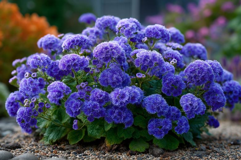 Обратите внимание на агератум, или «долгоцветку» — растение, которое при минимальном уходе формирует плотные компактные кустики сферической формы, сплошь покрытые пушистыми соцветиями. Семена агератума сеют на рассаду в марте, а высаживают в грунт в июне. Уже через несколько недель кустики превращаются в аккуратные шары высотой 15–30 см, усыпанные мелкими цветками-помпончиками сиреневых, голубых, розовых или белых оттенков. Цветение длится с июня до самых заморозков.