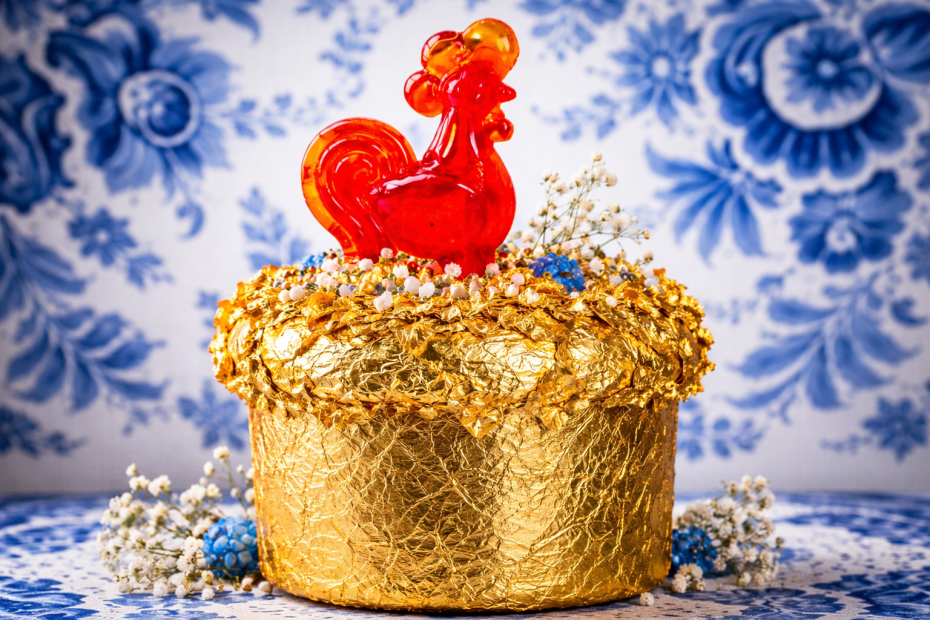 В трендах украшений кулича в этом году — красные кокошники и петушки.